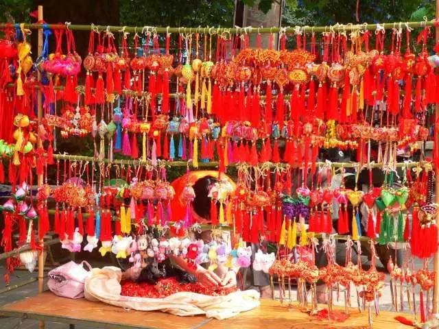 端午节小孩佩香囊,传说有避邪驱瘟之意,实际是用于襟头点缀装饰。香囊内有朱砂、雄黄、香药,外包以丝布,清香四溢,再以五色丝线弦扣成索,作各种不同形状,结成一串,形形色色,玲珑可爱。