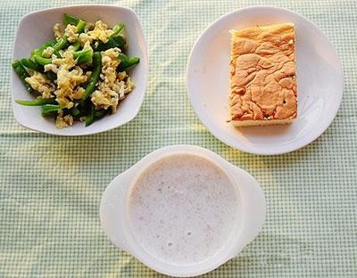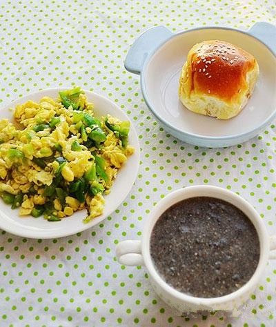 7、肉松面包+山药黑豆核桃杏仁芝麻糊+青椒炒蛋