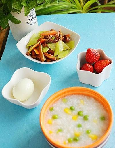 16、玉米青豆粥+胡萝卜莴笋炒笋+白煮蛋+草莓