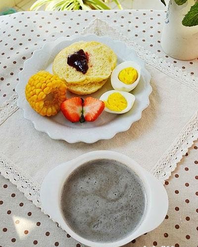 18、果酱面包+玉米+白煮蛋+黑芝麻糊+草莓