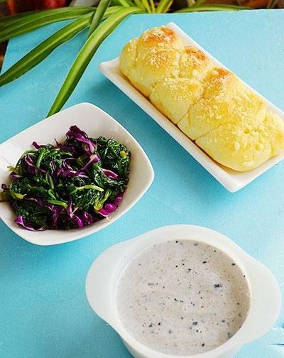 12、酥粒辫子面包+紫甘蓝拌菠菜+核桃芝麻牛奶麦片