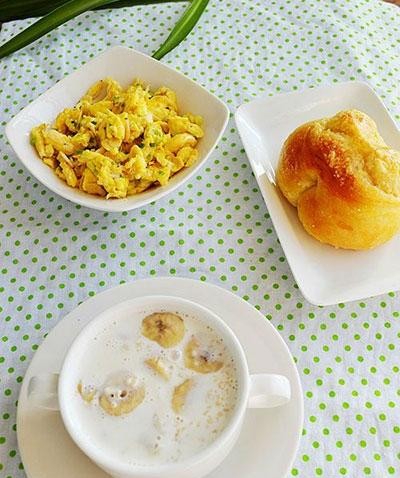 17、奶酪面包卷+虾皮炒蛋+香蕉牛奶麦片