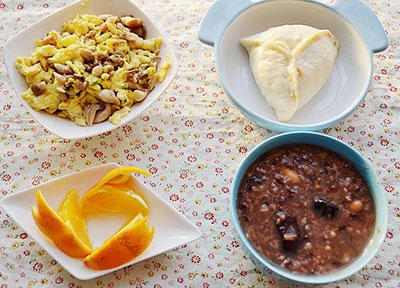 6、糖三角+八宝粥+小蘑菇炒蛋+橙
